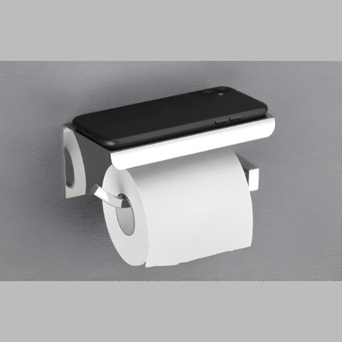 Innovative paper holder with integrated mobile stand. Combines functionality and convenience, keeping toilet paper accessible while securely holding your phone. Perfect for modern bathrooms with a sleek design.